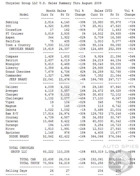 Chrysler Group reported total U.S. sales for August of 93,222 units, an increase of 5 percent compared with July and a decrease of 15 percent compared with the same time period in 2008. Retail sales for August were 68,958 units. The company finished the month with 100,238 units in inventory, representing a 28-day supply. Inventory is down 74 percent versus August 2008 when it totaled 380,560 units. Overall industry figures for August are projected to come in at an estimated 14.4 million SAAR.