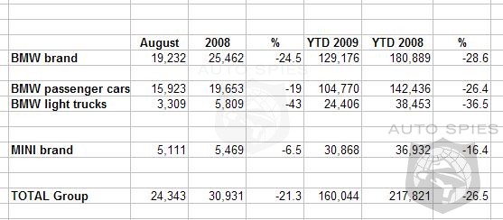 The BMW brand also had its best month this year with a total of 19,232 units (-24.5 percent). Year-to-date, BMW brand sales were down 28.6 percent to 129,176 vehicles compared to 180,889 vehicles sold in the same period of 2008.