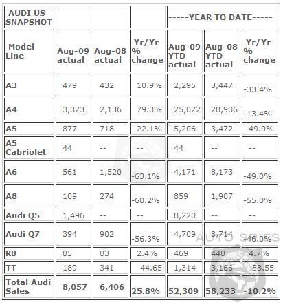 During August 2009, Audi sold 6,167 cars and 1,890 SUVs. From January through August 2009, Audi sold 39,380 cars and 12,929 SUVs.