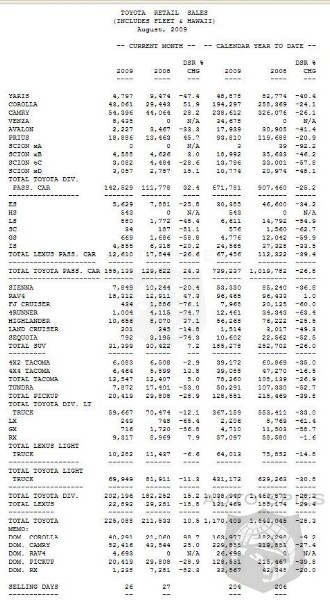 Toyota Division passenger cars recorded an all-time, best-ever month with sales of 142,529 units, up 32.4 percent over the same period last year. Camry and Camry Hybrid remained Toyota's volume leader in August, and posted an all-time, best-ever month with combined monthly sales of 54,396 units, up 28.2 percent over August 2008. The Prius mid-size gas-electric hybrid posted August sales of 18,886 units, up 45.7 percent from the year-ago month. Corolla recorded sales of 43,061 units, up 51.9 percent over last August. Yaris reported sales of 4,797units for the month.