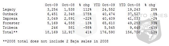 Subaru of America, Inc. announced record-breaking October sales. The company not only had its best October sales ever, but also had its best October sales for the Subaru Forester, Legacy and Outback models. The Company sold 18,169 units in October 2009 versus 12,917 units in October 2008, resulting in a 41-percent gain year-over-year. Subaru had a 13-percent gain year-to-date with 176,590 units sold in 2009 versus 156,706 units sold in 2008.