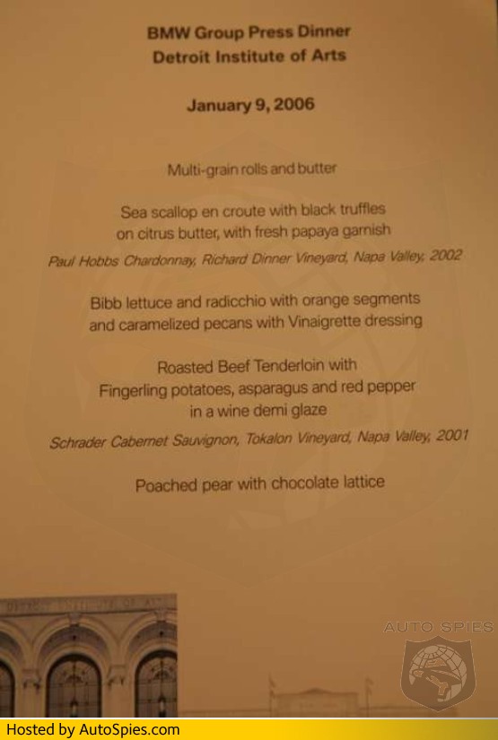 Forget the firehouse...that's for the commoners!001 and 004 were making the rounds at the coolest dinner party at the 2006 Detroit auto show.And we have the pics to prove it. Panke, Bangle, Van Hooydonk were just some of the names present at the BMW press dinner inside the most beautiful room in Detroit. We're talking about the gorgeous Detroit Institute of Arts building. Special thanks to the PR staff at BMW for the invite.