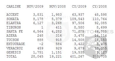 Hyundai Motor America today announced November sales of 28,045 units, a 46 percent increase compared with November 2008. Calendar year-to-date, Hyundai sales are up 6.2 percent to a total of 401,267 through November. This marks the eleventh consecutive month of year-over-year gains in retail market share. "While we have continued to deliver substantial year-over-year sales gains and sustained market share growth, we were, quite frankly, hoping that the economy and overall industry would have bounced back a bit more than we are seeing right now," said Dave Zuchowski, vice president of sales. "Looking ahead to December, we're confident we'll finish the year with market share at least a full percentage point above our record 3 percent share in 2008."