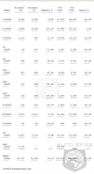 Mercedes-Benz USA (MBUSA) today reported November sales of 16,797 vehicles, a 19.1% improvement over November 2008. The all-new, 9th generation E-Class, continued to show strong demand with sales of 4,824 for November 2009, up 113.1% over November 2008. The other volume leaders for the month were the C-Class and M-Class with sales of 4,022, and 2,679 respectively.