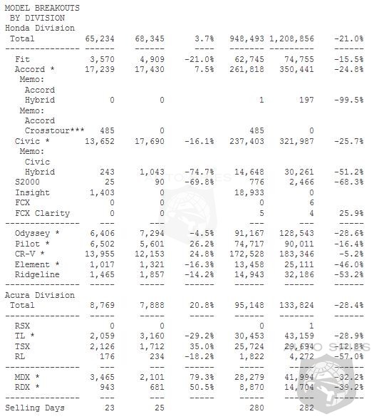 Acura Division sales increased 20.8 percent to 8,769. The MDX led the division with sales of 3,465, an increase of 79.3 percent. The TSX and RDX also recorded gains, up 35.0 percent and 50.5 percent, respectively.
