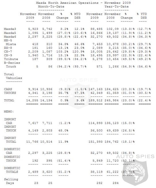 Mazda North American Operations (MNAO) today reported November 2009 sales of 14,255 units, an increase of 9.6 percent versus November of 2008 on a DSR (daily selling rate) basis (23 selling days in November 2009 compared to 25 selling days last November), up 0.9 percent unadjusted. Overall, total yearly sales are reported at 189,512, down 22.4 percent DSR (23.0 percent unadjusted) compared to 2008.