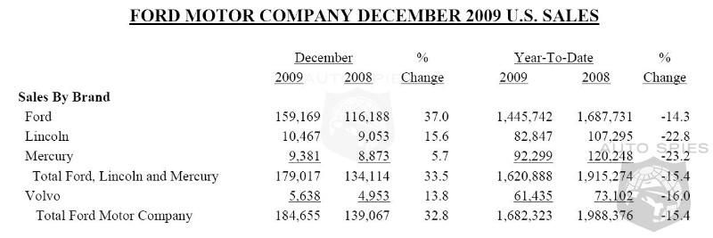Ford, Lincoln and Mercury December sales totaled 179,017, up 33 percent versus a year ago. Full-year sales totaled 1.62 million, down 15 percent.