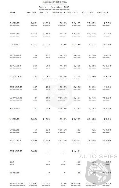 Mercedes-Benz USA (MBUSA) reported December sales of 20,025 vehicles, its highest monthly volume of the year, bringing the company's total 2009 volume to 190,604 and narrowing the gap versus last year to 15.3 percent. Ernst Lieb, president and CEO of MBUSA said: "The strong finish to a year marked by challenges on every front, underscores the customer confidence in the Mercedes-Benz brand and the unstinting efforts we have undertaken in partnership with our retail network to provide an unparalleled ownership experience."