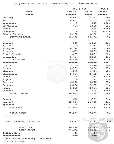 Chrysler Group reported total U.S. sales for December of 86,523 units. Sales increased 36 percent month-over-month and declined 4 percent year-over-year. The company finished the year with 931,402 units sold, a decline of 36 percent compared with 2008. Inventory is down 55 percent compared with December 2008, with 178,538 units in inventory, representing a 58-day supply. Overall industry figures for November are projected to come in at an estimated 11.3 million SAAR.
