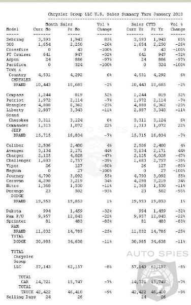 Chrysler Group reported total U.S. sales for January of 57,143 units. U.S. sales decreased 8 percent compared with the same period last year (62,157 units). Inventory (172,803 units) is down 52 percent compared with January 2009 (359,980 units), representing a 73-day supply. Overall industry figures for January are projected to come in at an estimated 10.9 million SAAR.