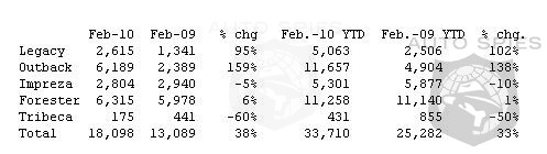Subaru of America, Inc. today announced a 38-percent sales increase for February 2010, resulting in a February sales record. The company sold 18,098 units in February 2010 versus 13,089 units sold in February 2009. Year-to-date sales increased 33-percent with 33,710 units sold versus 25,282 units sold over the same period last year. The Subaru Outback once again more than doubled its sales from the previous month, resulting in a 159-percent sales increase. The Outback had sales of 6,189 units in February 2010 versus 2,389 units in February 2009. Year-to-date, the Outback also more than doubled its sales with a 138-percent increase with 11,657 units sold versus 4,904 units sold over the same period last year.