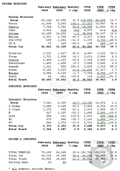 Nissan North America, Inc. (NNA) today reported February 2010 sales of 70,189 units versus 54,249 units a year earlier, an increase of 29.4 percent, compared with February 2009. Nissan Division sales rose 31.9 percent for the month, while sales of Infiniti vehicles were 10.7 percent higher than a year before. "Both the Nissan and Infiniti divisions experienced strong sales in February, with combined sales up 29.4 percent from last year," said Brian Carolin, senior vice president, Sales and Marketing, NNA. "The gains were posted across our car and truck lineups."