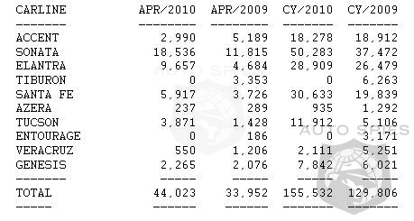 Hyundai Motor America today announced an all-time sales record for the month of April as early consumer response to the company's all-new Sonata and Tucson models shattered all expectations. Total sales through the first four months of 2010 also represent an all-time record for Hyundai.