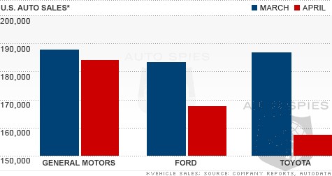 NEW YORK (CNNMoney.com) -- Major automakers posted double-digit gains in U.S. sales in April compared to the battered sales of a year ago, but the overall pace of sales fell short of March results.
