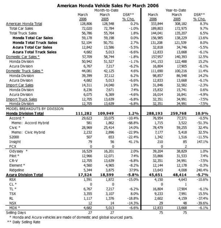 With strong light truck and robust sales of the all-new 2006 Civic, American Honda Motor Co., Inc., posted record March results of 128,806 Honda and Acura vehicle sales, an increase of 0.2 percent over March 2005. Light trucks for American Honda also posted record March results with sales of 56,786, up 1.8 percent. Year-to-date American Honda total vehicle sales of 333,844 are up 8.3 percent on a daily selling rate basis.