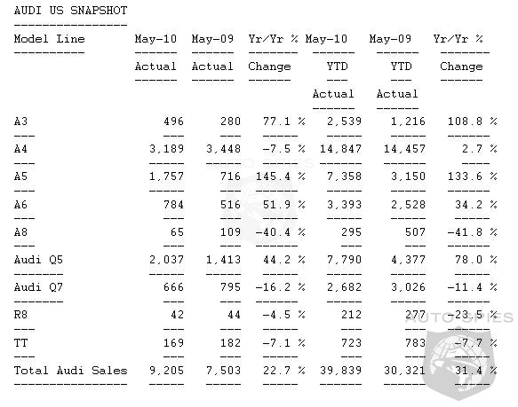 Through the first five months of this year, Audi has enjoyed a 31.4% increase over 2009, with 39,839 vehicles sold.