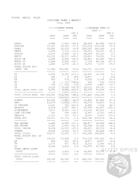 Toyota Division recorded sales of 150,629 vehicles, a decrease of 7.2 percent from the year-ago month, on a DSR basis. On a raw volume basis, Toyota Division sales were down 3.6 percent compared to last July. Lexus reported sales of 18,595 units in July, down 3.3 percent from July 2009, on a DSR basis. Volume-wise, Lexus Division sales were up 0.4 percent compared to the year-ago month.