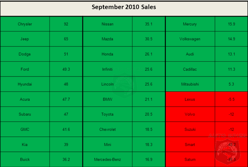 September of 2009 was a poor month for automakers as the industry tried to recover from cash for clunkers, thus it was no surprise that September 2010 sales would be significantly higher than a year ago. In fact all but five brands improved their sales upon a year ago and almost all of those brands saw double digit growth. Chrysler paced everyone with a 92% improvement while other domestic brands showed strong sales improvements as well. Luxury brands were led by Infiniti's 25% sales improvement. Perhaps the biggest surprise of the month was the fact that Lexus' 5.5% drop in sales joining the likes of Volvo, Suzuki and Smart.