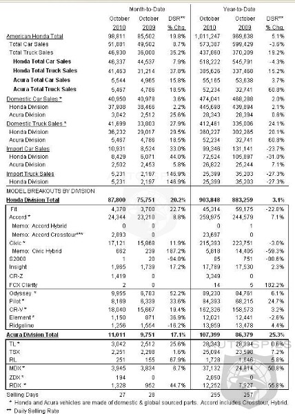 American Honda Motor Co., Inc., posted October sales of 98,811 vehicles, an increase of 19.8 percent based on the daily selling rate*, the company announced today. American Honda year-to-date sales reached 1,011,247, an increase of 5.1 percent versus last year based on the daily selling rate.Honda Division posted October sales of 87,800, an increase of 20.2 percent versus last year. The Accord was the top-selling Honda model for the month with sales of 24,344, up 8.8 percent, followed by the CR-V with sales of 18,040, up 19.4 percent, and the Civic with sales of 17,121, up 11.9 percent. The availability of the all-new 2011 Odyssey, in its first full month on the market, contributed to that model's increase of 52.2 percent for a total of 9,955. Overall, Honda Division light-truck sales increased 37.8 percent to 41,463.