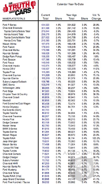 More importantly, The Truth About Cars compiled a nice year-to-date sales record of a bunch of popular vehicles and the results are pretty telling. From a year-over-year perspective, it's clear that certain cars have made huge strides saleswise. Check out the movers and shakers:
