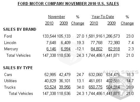 Consumer demand for Ford Motor Company's fresh lineup of high-quality, fuel-efficient vehicles boosted November sales 24 percent versus a year ago, with 147,338 units sold.