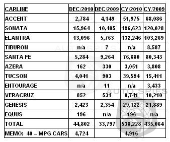 Hyundai Motor America today announced December sales of 44,802 units, up 33 percent versus 2009. For the full year, Hyundai reported 538,228 sales, up 103,164 units from last year for a 24 percent gain and an all-time Hyundai sales and market share record for the year. December retail sales were up 54 percent from last year due to improving product availability and a popular Hyundai Holiday marketing effort that helped increase traffic to Hyundai.com 120 percent over last year. Full year retail sales were up 35 percent. Fleet sales mix for the month of December was 7 percent, with fleet mix for the year at 16 percent.