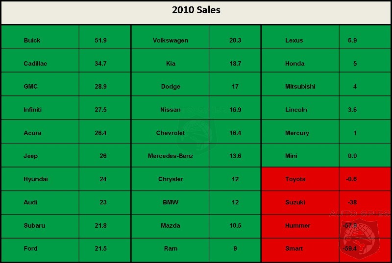 December 2010 proved to be a very good month for the auto industry with most brands posting significant increases in sales over last December. In fact, Mini and Mercedes-Benz posted best December sales in their company history. 2010 as a year on the whole also proved to be much better for the auto industry compared to the past few years. All brands save Toyota and Suzuki were able to improve their sales compared to 2009. General Motor's premium divisions led all brands with Buick improving by 51.9% and Cadillac with 34.7% respectively. Hyundai and Ford bested all of the other mainstream competition with 24 and 21% improvements. The 21% sales improvement allowed Ford to outsell Chevrolet and Toyota for the year. Hyundai, Kia and Audi all had 2010 turn out to be the best year in their history. Take a look at the chart below to see how everyone did in 2010 compared to 2009.