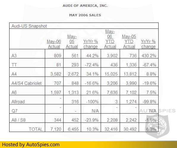 Audi of America, Inc. reported May sales of 7,120, representing a 10.3 percent increase over May 2005 sales of 6,455. Last month's figures were the highest totals for May since 2003. For the year, Audi sales are up 6.3 percent at 32,416.