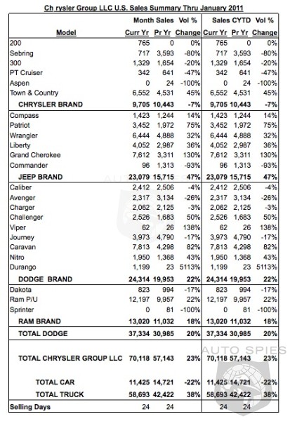 Chrysler Group LLC today reported U.S. sales of 70,118, a 23 percent increase compared with sales in January 2010 (57,143 units).