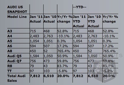Audi today reported January U.S. sales of 7,812 Audi cars and SUVs, which accounted for a 20% overall increase from January 2010. The previous January sales record for Audi in the U.S. was the 6,510 vehicles sold in 2010.
