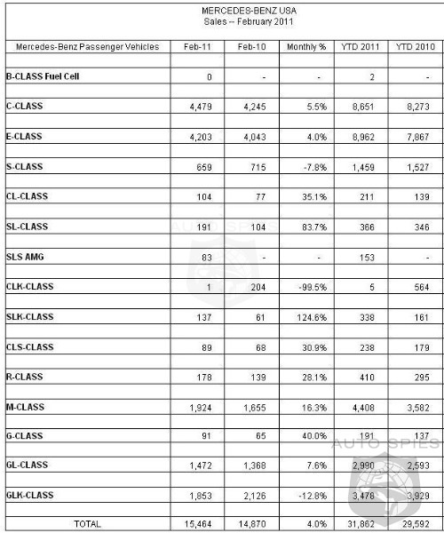 Mercedes-Benz USA (MBUSA) today reported February sales of 16,176 vehicles, a 5.1 % improvement over February 2010 and the highest February volume since 2008. On a year-to-date basis, the 33,449 vehicles sold represent a 9.5% increase. The highest volume performers for the month were the C- and E-Class model lines. The sporty C-Class – the gateway to the Mercedes-Benz brand for younger and first-time Mercedes-Benz buyers – lead the pack with sales of 4,479, up 5.5% over February 2010. The 9th generation E-Class continued its strong momentum with sales of 4,203, up 4% over February 2010. MBUSA's versatile SUV, the M-Class, followed in volume with sales of 1,924, up 16.3% compared to February 2010 while the compact GLK SUV trailed closely with sales of 1,853.
