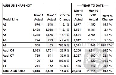- Month-to-month Audi sales increase of more than 25% over February 2011, and 14.3% YOY increase.