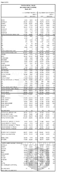 Toyota Motor Sales (TMS), U.S.A., Inc., today reported March sales results of 176,222 units, a decrease of 9.2 percent compared to the same period last year, on a daily selling rate (DSR) basis. On a raw volume basis, unadjusted for 27 selling days in March 2011 compared to 26 selling days in March 2010, TMS sales were down 5.7 from the year-ago month. The Toyota Division posted March total sales of 155,540 units, a decrease of 10.1 percent on a DSR basis from March 2010, a month in which TMS reported record-high market share for the year. On a raw volume basis, Toyota Division sales were down 6.7 percent from the year-ago month. The Lexus Division reported total sales of 20,682 units, down 1.5 percent from March 2010, on a DSR basis. Volume-wise, Lexus Division sales were up 2.3 percent over last March.