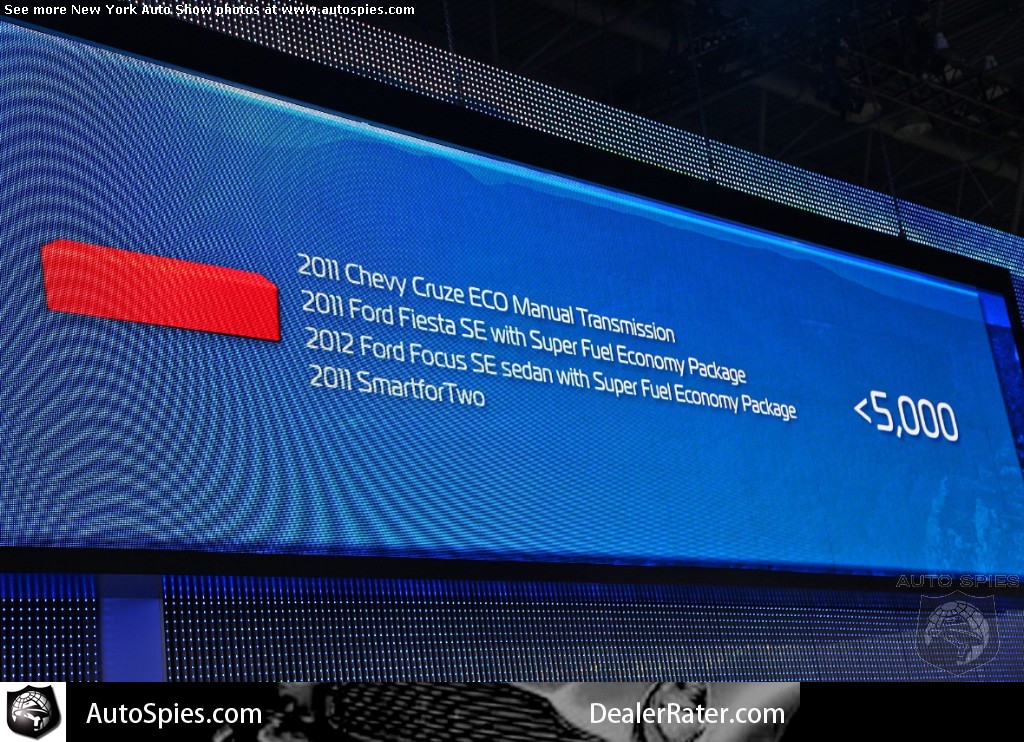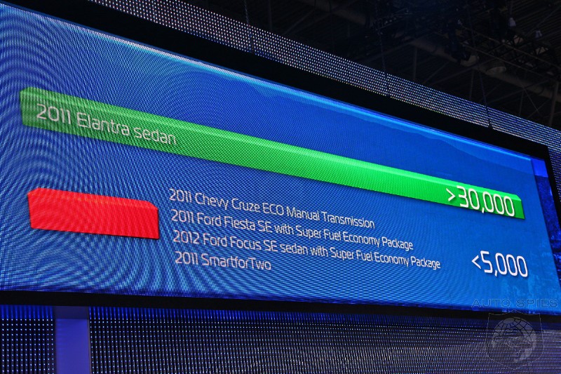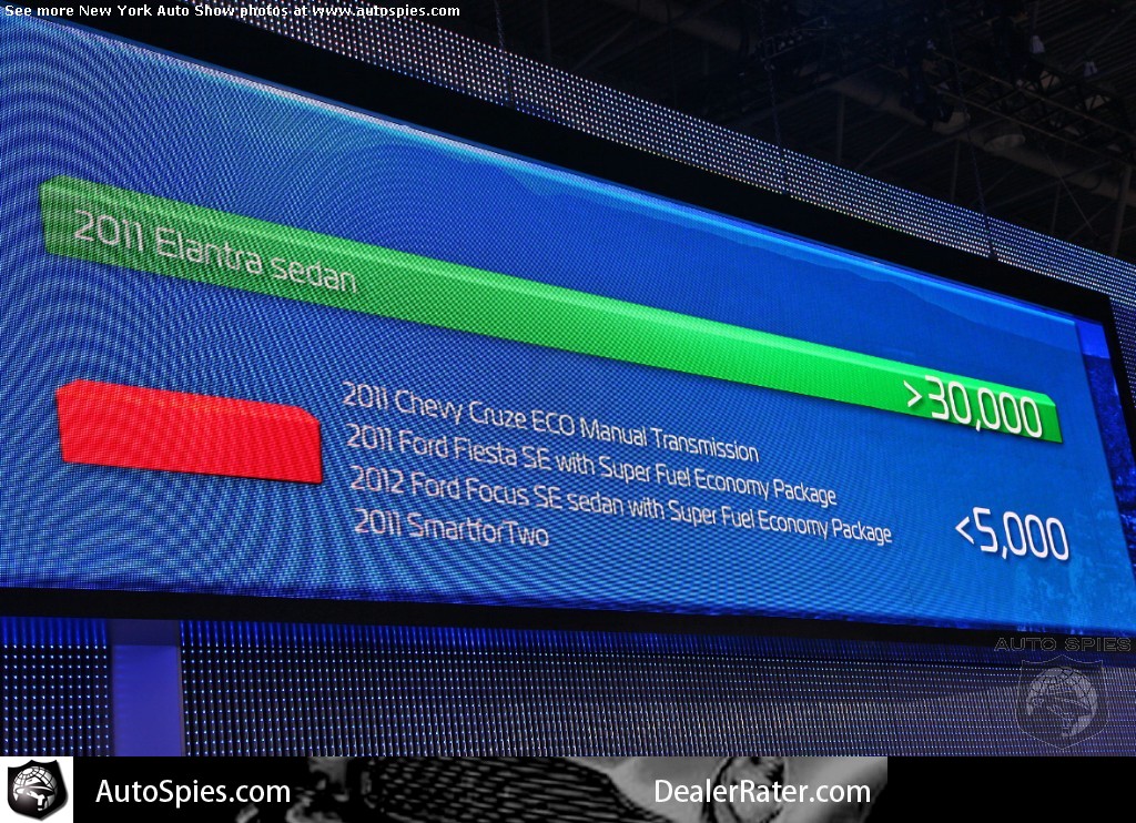 Leave it AutoSpies' car of the year, the 2011 Hyundai Elantra, to make one of the biggest waves at the 2011 New York Auto Show. It wasn't because it was receiving an update or new exterior either.Now it doesn't take a rocket scientist to see that this car is simply everywhere. I have done plenty of driving a good amount the past several weeks and one thing is certain; there are tons of all-new Elantras being sold.But Hyundai went and found some interesting data points. Although the Chevrolet Cruze is said to have sold approximately 50,000 units, it hasn't been too many of the ECO versions -- which is used to advertise the Cruze, thanks to the asterisk.When comparing sales of the Elantra versus the Fiesta SFE package, Cruze ECO and Smart ForTwo, beats them all -- combined -- by six times. Yeah, six.**Stay tuned to AutoSpies.com for the BEST photographs LIVE from the 2011 New York Auto Show2011 New York Auto Show Photo Gallery2011 New York Auto Show Photo GalleryNew York Auto Show Preview Photo Gallery2012 Audi A7 USA Model Photo GalleryLexus LF-Gh Concept Photo Gallery2012 Audi Q3 Photo GalleryAutoSpies.com Photo GalleriesIf you want to see your photos running on our homepage photo ticker, be sure to upload your photos on the go by sending them to Mobile@AutoSpies.com Share on Facebook