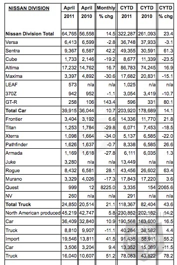 NOTE: To ensure consistency in global sales reporting, Nissan North America calculates monthly variances on a straight-percentage basis, unadjusted for the number of selling days. April 2011 had 27 selling days, while April 2010 had 26 selling days.