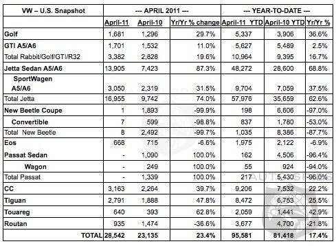 Volkswagen of America, Inc. today reported 28,542 units sold in April 2011, a 23 percent increase over prior year sales and the company's best sales month since November 2003. Year-to-date sales are up 17 percent. "We are gaining traction in the U.S. market," said Jonathan Browning, President and CEO, Volkswagen of America, Inc. "With our Jetta model continuing to lead the way, the numbers show our product line up is responding to consumers needs for performance, precision engineering and smart fuel economy."