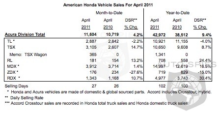 As the warmer months approach, sales of Acura cars have overtaken light truck sales. Led by TSX sport sedan sales of 3,105 units, total Acura car sales for April 2011 were 6,173 - up 6.1 percent based on Daily Selling Rate* (DSR). Total Acura sales were 11,604 units, up 4.2 percent. “Last month Acura's line-up of sports sedans showed their strength,” said Jeff Conrad, vice president of Acura sales. “Thanks in part to the all-new TSX Sports Wagon, sales of the fun and practical TSX were up 14.7 percent.”
