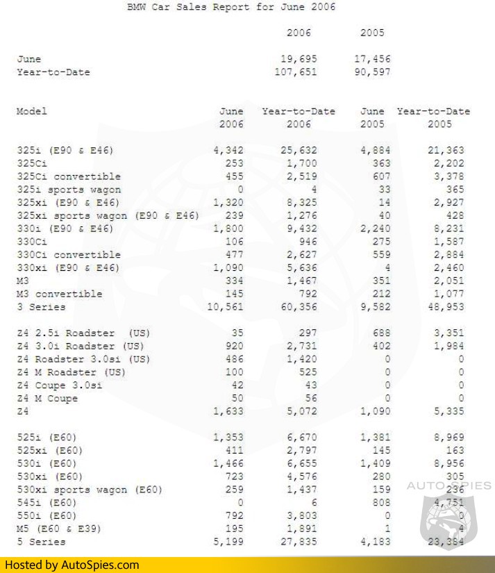 Year-to-date BMW brand sales were up 11.7 percent, to 137,220 vehicles compared to 122,864 vehicles sold in first six months of 2005.