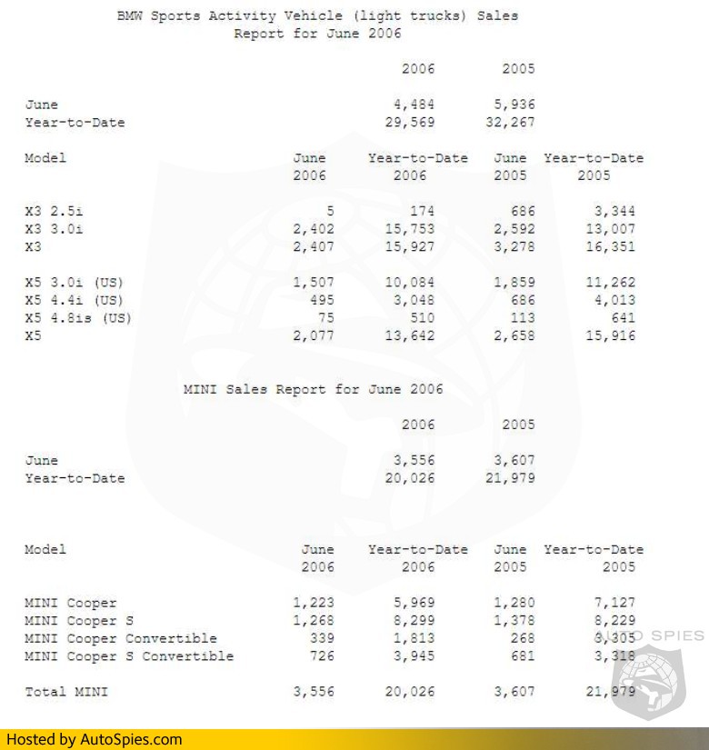 MINI USA reported June sales of 3,556 automobiles, off 1.4 percent from the 3,607 cars sold in June 2005. Year-to-date, the division reported sales of 20,026 automobiles, a drop of 8.9 percent, compared to the 21,979 cars reported in the first six months of 2005.