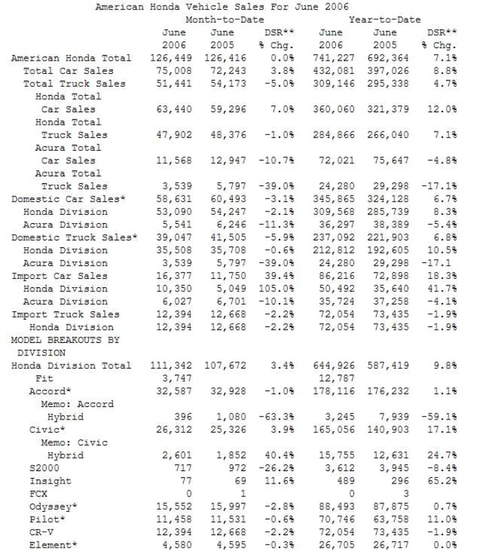 Honda Division posted its sixth consecutive record month with June sales, up 3.4 percent to 111,342 cars and light trucks. Record June