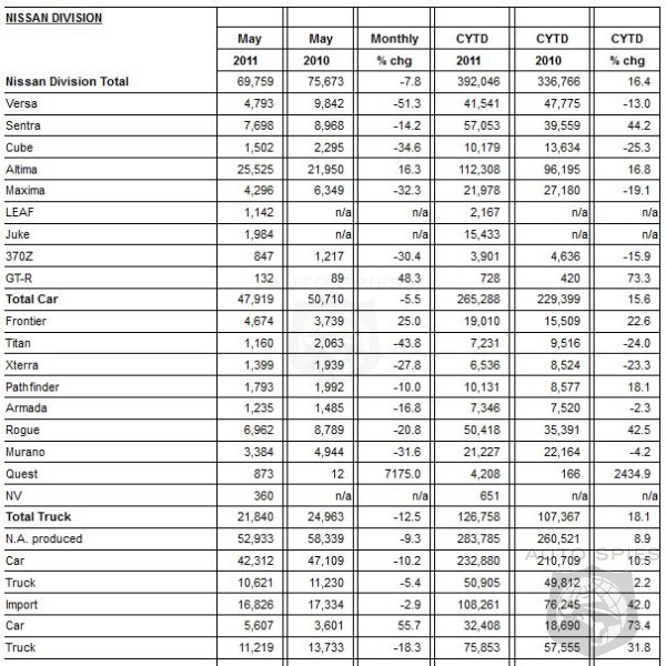 NOTE: To ensure consistency in global sales reporting, Nissan North America calculates monthly variances on a straight-percentage basis, unadjusted for the number of selling days. May 2011 had 24 selling days, while May 2010 had 26 selling days.