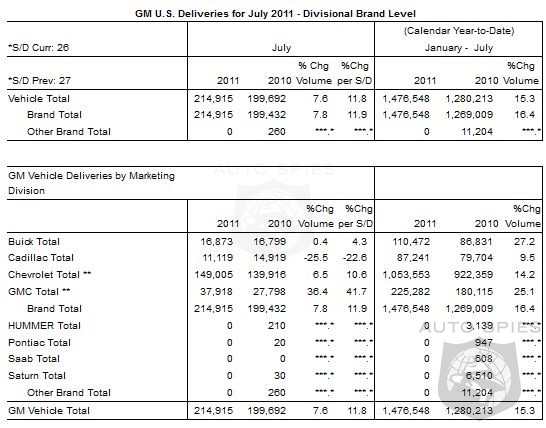 - GMC: GMC reported its best month of 2011 with total sales of 37,918, a 36-percent increase compared to the same month last year. Retail sales were up 17 percent for the brand on strong demand for the Terrain (up 67 percent) and the Acadia (up 33 percent). Sierra retail sales rose 2 percent year over year and increased 2 percent compared to June. July also marked the 22nd consecutive month of year-over-year total and retail sales increases for the brand. Through July, GMC total sales are up 25 percent, while retail sales have risen 23 percent (read more).