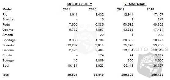 After completing an historic first half of 2011 with record sales and market share gains, Kia Motors America's (KMA) upward trajectory continues as the company recorded its best-ever July sales of 45,504 vehicles. Led by the U.S.-built(1) Sorento CUV, which posted its all-time best monthly sales of 13,262 units, KMA's July sales were up an impressive 28.5 percent over the same period last year and also included strong performances from the Soul, Optima and Forte. KMA has achieved new monthly sales records for 11 consecutive months. "More and more consumers are discovering Kia Motors every day as our diverse lineup of stylish and fun-to-drive cars and CUVs attract customers looking for a compelling combination of world-class design, outstanding quality, fuel efficiency, state-of-the-art technology and tremendous value," said Byung Mo Ahn, group president and CEO of KMA and Kia Motors Manufacturing Georgia (KMMG). "With the long-term success of our two best-selling products – Sorento and Soul – the overwhelmingly positive response the new Optima has received and the arrival of the all-new Rio models later this year, Kia is well-positioned for continued sales and market share growth in the second half of 2011 and beyond."