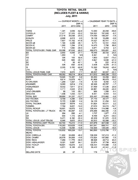 Toyota Motor Sales (TMS), U.S.A., Inc., today reported July sales of 130,802 units, a decrease of 19.7 percent from the same period last year on a daily selling rate (DSR) basis. On a raw volume basis, unadjusted for 26 selling days in July 2011 compared to 27 selling days in July 2010, TMS sales were down 22.7 percent from the year-ago month. Compared to June 2011, sales increased 17.9 percent on both a DSR and raw volume basis. Toyota Division recorded July sales of 116,263 vehicles, a decrease of 19.8 percent from the year-ago month on a DSR basis. On a raw volume basis, Toyota Division sales were down 22.8 percent compared to July 2010. Lexus Division reported July sales of 14,539 units, a decrease of 18.8 percent from last year on a DSR basis. Volume-wise, Lexus Division sales were down 21.8 percent from the year-ago month.