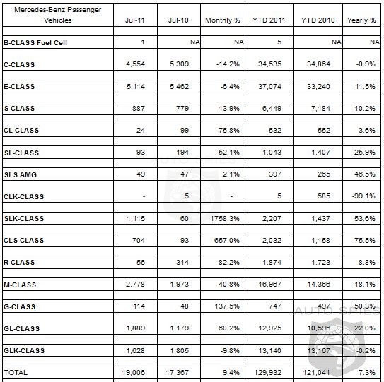 Mercedes-Benz USA (MBUSA) today reported July sales of 21,065 vehicles, a 16.7% improvement over July 2010, and the company's highest July volume since 2006. On a year-to-date basis, the 139,086 vehicles sold represent an 11.3% increase. The highest volume performers for the month were the E- and C-Class model lines. The 9th generation E-Class led the pack with sales of 5,114 and the sporty C-Class – the gateway to the Mercedes-Benz brand for younger and first-time Mercedes-Benz buyers – followed with sales of 4,554. MBUSA's stylish SUV, the M-Class, finished third in volume with monthly sales of 2,778 up 40.8% over last July. Additionally, sales of the all-new SLK roadster were up 1,758.3% and the all-new 2012 CLS-Class posted a 657% increase over July 2010. Sales of the full-sized GL-Class SUV were up 60.2% for the month as well.