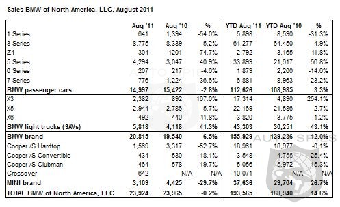 The BMW Group in the U.S. (BMW and MINI combined) reported August sales of 23,924 vehicles, a decrease of 0.2% from the 23,965 vehicles sold in the same month a year ago. Year-to-date, BMW Group sales are up 14.6% to 193,565 in the first eight months of 2011 compared to 168,940 in the same period in 2010.