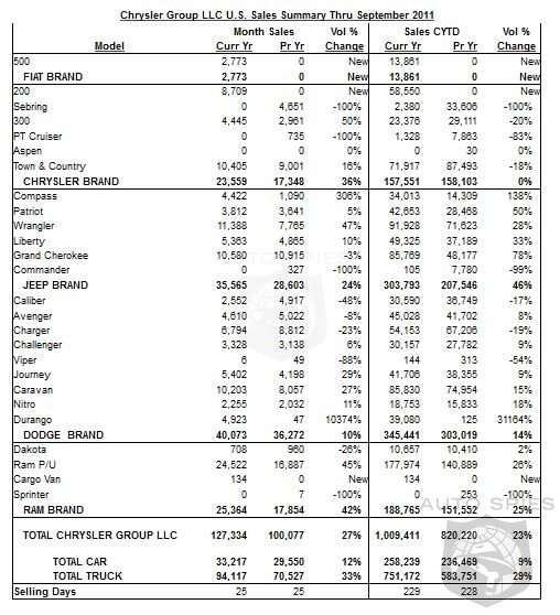 - Chrysler Group car sales (33,217 units) were up 12 percent versus September 2010 (29,550 units)