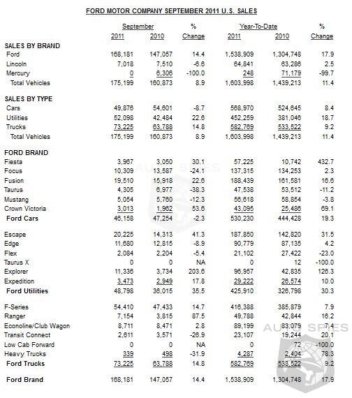 Driven by a 35 percent increase in Ford brand utilities and a 15 percent gain in Ford truck sales, Ford Motor Company's September sales totaled 175,199, up 9 percent versus last year.