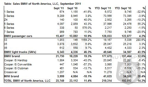 The BMW Group in the U.S. (BMW and MINI combined) reported September sales of 25,749 vehicles, an increase of 11.4% from the 23,112 vehicles sold in the same month a year ago. Year-to-date, BMW Group sales are up 14.2% to 219,314 in the first nine months of 2011 compared to 192,052 in the same period in 2010.