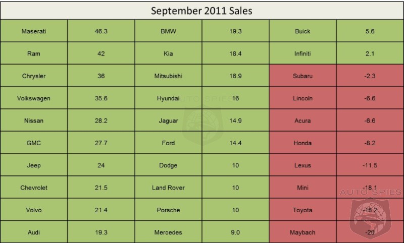 Even amidst an uncertain economic outlook, September 2011 auto sales were about 10% better than a year ago and September turned out to be one of the best month of the year so far. As in previous months roughly two-thirds of the brands posted better sales than a year ago while Toyota and Honda continued to see their sales slide. Leading the pack was Maserati with an exceptional 46.3 percent improvement. In the mainstream category Chrysler and its truck division Ram posted improvements of 42 and 36% respectively. Powered by the debut of its much talked about American built Passat, Volkswagen was able to increase its sales by over 35% as well. Backing up its promise of great dealership availability Nissan posted a 28.2% sales increase, on the other hand its luxury division Infiniti only managed to better last year's results by 2.1%. Doing well in the luxury category Audi and BMW both posted 19.% sales improvements while Lexus continued to struggle with an 11.5% drop.